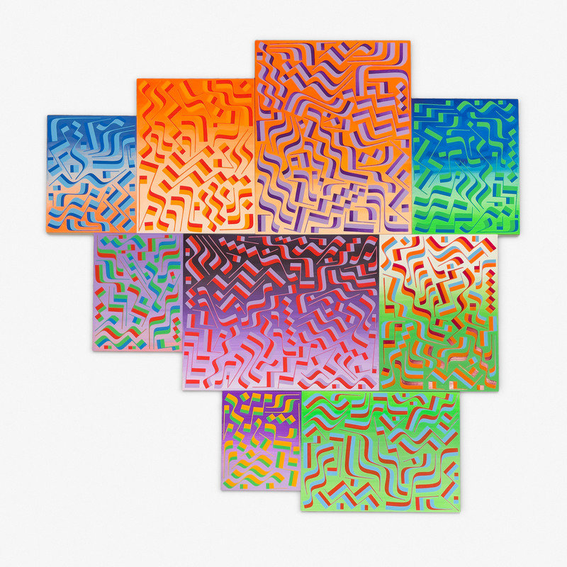 Isaac Tin Wei Lin explores the realm where representation and buzzing abstraction meet. His surfaces are often densely covered in calligraphic, brushed and hand-drawn patterns that express both the logic and complexity of written language. Lin's dense calligraphy—a kind of graffiti in which comprehensible lettering gives way to pure form—evoke patterns and structures found in nature. His abstraction brings to mind single cell organisms, entangling kudzu vines, DNA helices, and pulsating constellations all rendered in effervescing colors. Working across painting, screenprinting, collage, installation, and mural-making, Lin also collaborates with other artists and photographers in creating hybrid works.