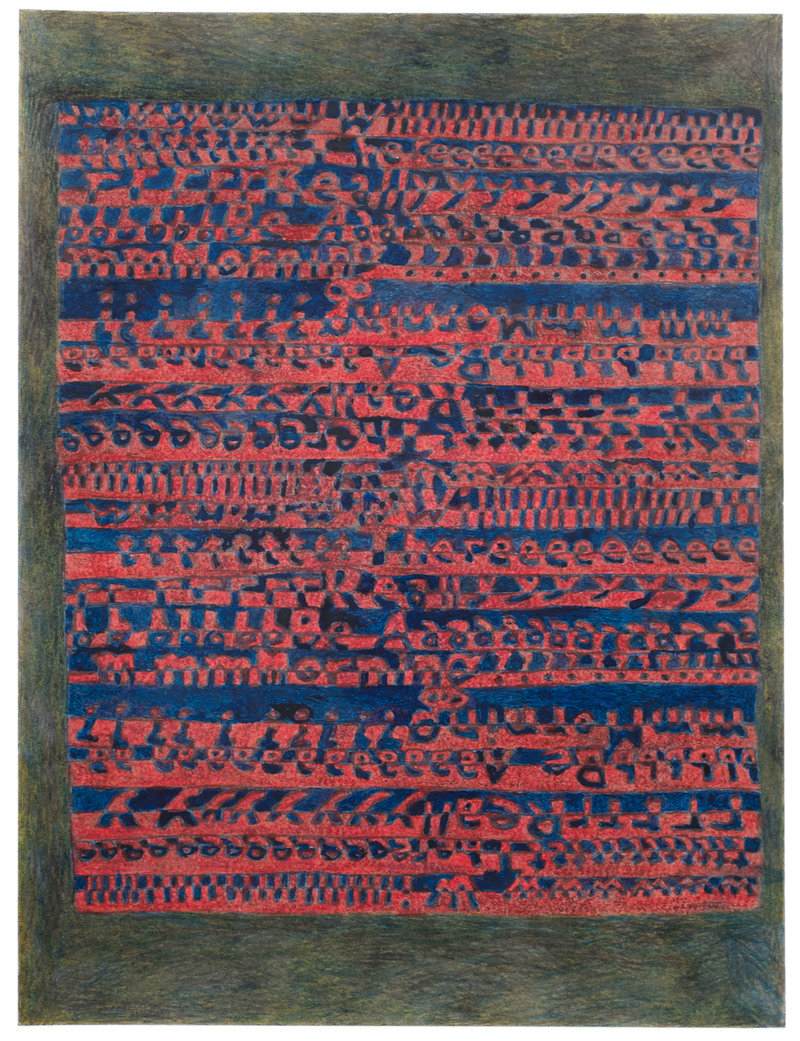 Jenny Cox’s marker drawings featured in her Fleisher/Ollman exhibition Like Logs consist of conglomerations of brightly-colored lozenges each containing words and various hatch marks—refugee text balloons from comics as if they were somehow stolen from their original sources, completely transformed by the artist, and stacked one on top of the other like logs. “Like logs” is also the title of a drawing in the exhibition and an accurate description of Cox’s accretive methodology in general. Jenny Cox began working at Lower Merion Vocational Training Center (LMVTC) in 1981 as a piece worker and paper shredder. When LMVTC became Center for Creative Works in 2011, the Wynnewood, PA studio and exhibition space dedicated to artists with developmental disabilities, she was hesitant to make art at first. She was eventually inspired to paint after observing her peers. Early paintings featured lines and dots as design elements, color studies realized through blending. Eventually, Cox discovered markers and pens, and her work took off: marks developing into letters, letters into words, and cells of color demarcating the space of her architecturally-minded compositions.