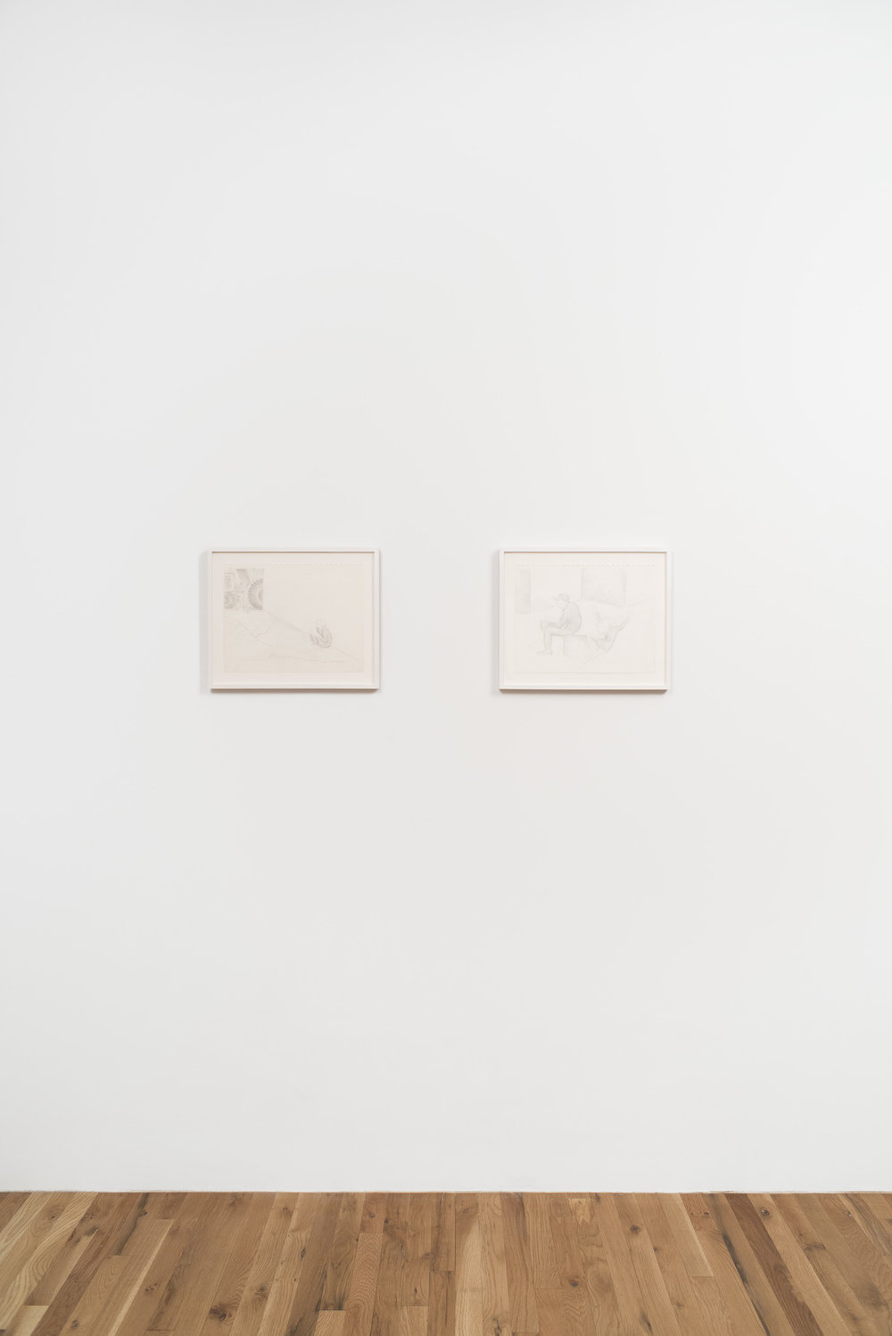 Byrd sometimes created drawings with an eye for their later realization as paintings, and in other instances, made them autonomously. Whether as preparatory studies or stand-alone works, the drawings showcase Byrd’s trademark attention to detail through careful rendering with a simultaneous blurring in which bodies transform into fuzzy specters. With Byrd, there is a pronounced symbiosis between drawing and painting. The lightness of his graphite touch bestows on the scene a similar hazy, surreal effect that he achieves through his signature dry brush, thinned oil painting technique. Fleisher/Ollman also presents a group of much smaller sketches on what appears to be scrap paper that are more spontaneous and presumably made on shifts at the VA Hospital.