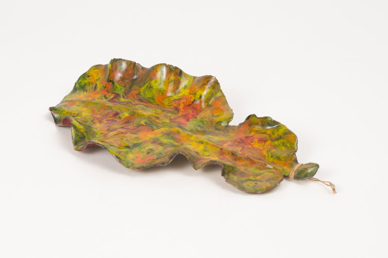 His interest in a wide-range of ideas, from the origins of the universe to Asian architecture to poetry and philosophy to amateur archaeology and horticulture, beget a staggering range and number of works. Von Bruenchenhein photographed his wife in a variety of erotic and exotic poses and contexts—part pin-up girl, part princess. He created ceramic sculptures including crowns, vessels composed of leaf patterns, and delicate flowers—all made from clay sourced from local construction sites, fired in the couple’s small parlor stove, and often spray-painted with automobile enamel. He made chicken bone towers inspired by both Khmer temples discovered in the pages of National Geographic as well as Sam Rodia’s Watts Towers, which he read about in his local newspaper. He created sculptures of mask-like heads made from concrete which he displayed outdoors. He painted fiery energy bursts conjuring epic events like cosmic genesis and the birth of otherworldly creatures with homemade brushes, his own fingers, sticks, bits of cloth, and combs. Later in life, Von Bruenchenhein focused his efforts on paintings of visionary architecture, echoing his bone towers as well as the leafy arches of his earlier clay vessels.