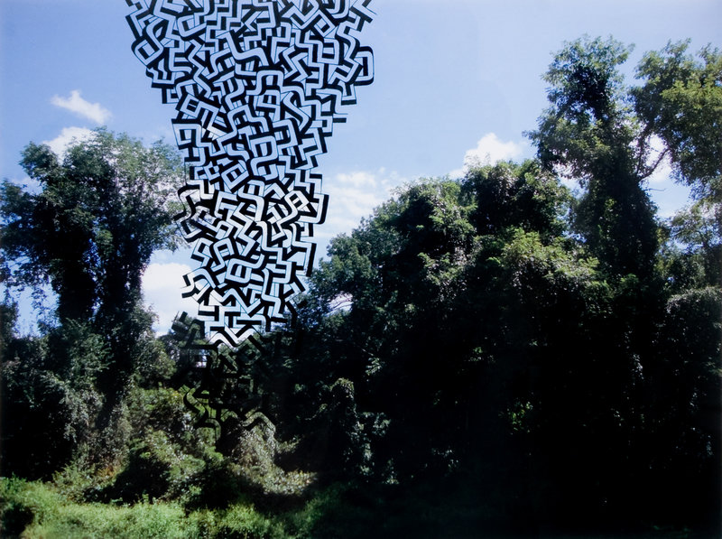 In the main gallery, Lin, best known for his graphic prints and paintings, will debut two major sculptural pieces. A variation on a piece shown at the Institute of Contemporary Art (Philadelphia) as part of Locally Localized Gravity in 2007, a simple room constructed from cardboard boxes is painted to resemble brick. The structure houses paintings and prints from floor to ceiling and resembles an abandoned building defaced over time. A second sculptural work, made from rigid insulation, is a tangle of three-dimensional lines and letters that simultaneously recall monuments, forests, and Matisse's cut-outs.