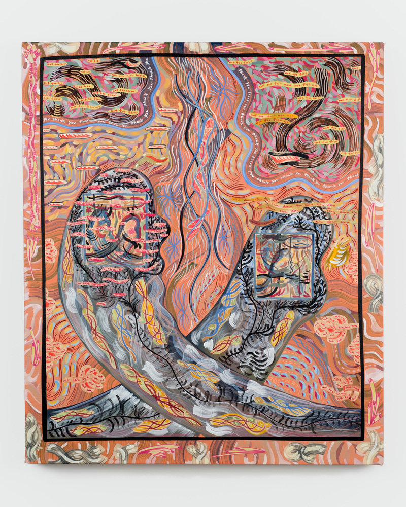Sarah Gamble and Molly Metz explore a post-portal experience as if the viewer has already entered another dimension or an alternate universe. Gamble’s paintings here feature crystals floating in space, prismatic light beams, and her ongoing interest in elaborate, all-over patterning employing dotwork and fleur-de-lis-like motifs. Gamble unites the spiritual and cosmic possibilities of abstraction and representation in the creation of paintings that examine the connective energy between different realities. If Gamble looks skyward toward the heavens for cosmic inspiration, then Metz is more attuned to looking downward at the microcosms of the terrestrial, the aquatic, and the microscopic. Strands of DNA, single-cell animals, and sea creatures seem to be suspended in a primordial soup of paint and collage. Tiny texts are often embedded within odd-shaped forms (cells, squiggles, gestures) with words occasionally so small that at first glance we might mistake them for thready bits of organic material. Many of the artist’s works have a painting on the reverse of the support.